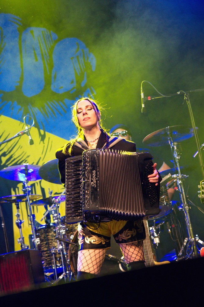 Після перерви настав час хедлайнера. Щойно розпочалося шоу, й не знати було, на кого дивитися в першу чергу – семеро музикантів на сцені створювали унікальне видовище, що зливалося в ідеальну єдність. Юджин Гуц – це особлива постать: його голос упізнаваний одразу, а його енергія неймовірно заразлива. Не можна не згадати й єдину жінку в гурті – Еріку з акордеоном. Вона зачаровувала не лише своєю зовнішністю, але й грою, яка передавала цілу палітру емоцій: від безтурботної радості до легкої запальності, завжди з гумором, без страху бути навіть трохи кумедною. Справжня сценічна постать.