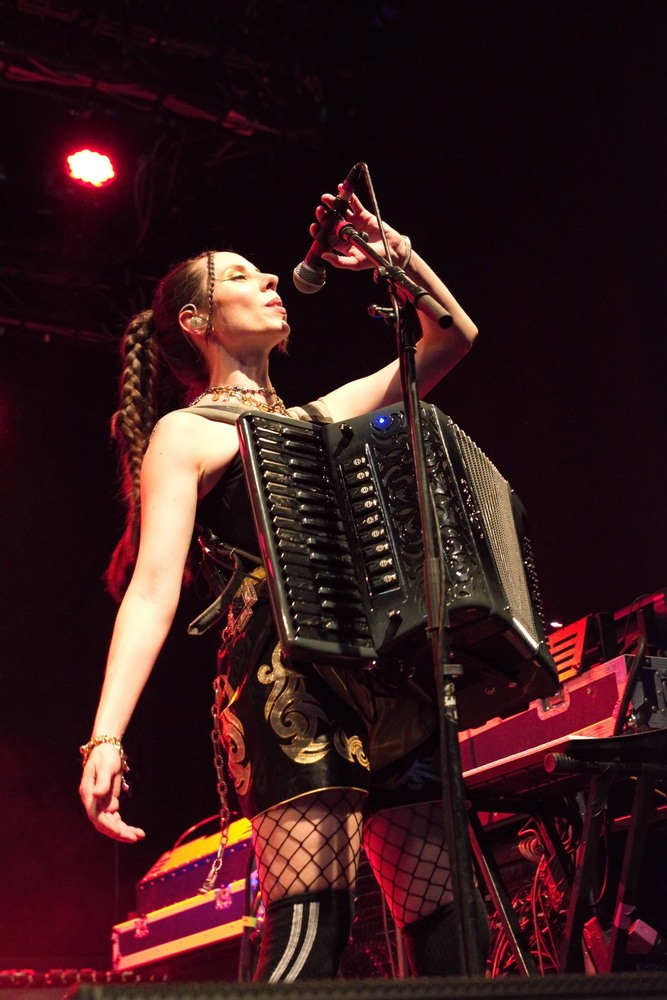 Після перерви настав час хедлайнера. Щойно розпочалося шоу, й не знати було, на кого дивитися в першу чергу – семеро музикантів на сцені створювали унікальне видовище, що зливалося в ідеальну єдність. Юджин Гуц – це особлива постать: його голос упізнаваний одразу, а його енергія неймовірно заразлива. Не можна не згадати й єдину жінку в гурті – Еріку з акордеоном. Вона зачаровувала не лише своєю зовнішністю, але й грою, яка передавала цілу палітру емоцій: від безтурботної радості до легкої запальності, завжди з гумором, без страху бути навіть трохи кумедною. Справжня сценічна постать.