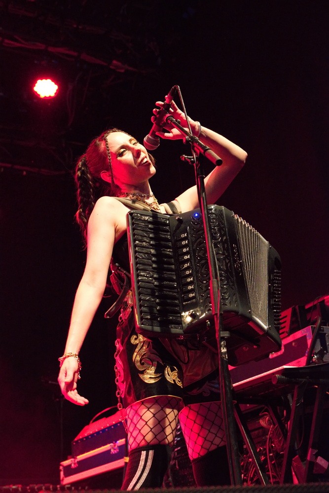 Після перерви настав час хедлайнера. Щойно розпочалося шоу, й не знати було, на кого дивитися в першу чергу – семеро музикантів на сцені створювали унікальне видовище, що зливалося в ідеальну єдність. Юджин Гуц – це особлива постать: його голос упізнаваний одразу, а його енергія неймовірно заразлива. Не можна не згадати й єдину жінку в гурті – Еріку з акордеоном. Вона зачаровувала не лише своєю зовнішністю, але й грою, яка передавала цілу палітру емоцій: від безтурботної радості до легкої запальності, завжди з гумором, без страху бути навіть трохи кумедною. Справжня сценічна постать.