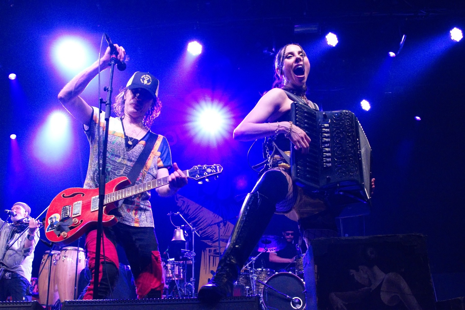 Після перерви настав час хедлайнера. Щойно розпочалося шоу, й не знати було, на кого дивитися в першу чергу – семеро музикантів на сцені створювали унікальне видовище, що зливалося в ідеальну єдність. Юджин Гуц – це особлива постать: його голос упізнаваний одразу, а його енергія неймовірно заразлива. Не можна не згадати й єдину жінку в гурті – Еріку з акордеоном. Вона зачаровувала не лише своєю зовнішністю, але й грою, яка передавала цілу палітру емоцій: від безтурботної радості до легкої запальності, завжди з гумором, без страху бути навіть трохи кумедною. Справжня сценічна постать.