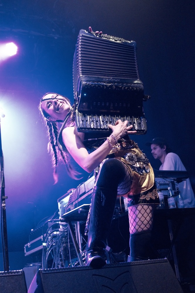 Після перерви настав час хедлайнера. Щойно розпочалося шоу, й не знати було, на кого дивитися в першу чергу – семеро музикантів на сцені створювали унікальне видовище, що зливалося в ідеальну єдність. Юджин Гуц – це особлива постать: його голос упізнаваний одразу, а його енергія неймовірно заразлива. Не можна не згадати й єдину жінку в гурті – Еріку з акордеоном. Вона зачаровувала не лише своєю зовнішністю, але й грою, яка передавала цілу палітру емоцій: від безтурботної радості до легкої запальності, завжди з гумором, без страху бути навіть трохи кумедною. Справжня сценічна постать.