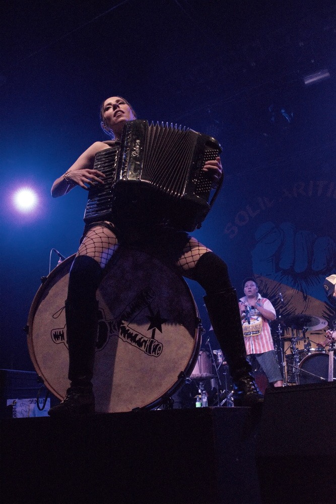 Після перерви настав час хедлайнера. Щойно розпочалося шоу, й не знати було, на кого дивитися в першу чергу – семеро музикантів на сцені створювали унікальне видовище, що зливалося в ідеальну єдність. Юджин Гуц – це особлива постать: його голос упізнаваний одразу, а його енергія неймовірно заразлива. Не можна не згадати й єдину жінку в гурті – Еріку з акордеоном. Вона зачаровувала не лише своєю зовнішністю, але й грою, яка передавала цілу палітру емоцій: від безтурботної радості до легкої запальності, завжди з гумором, без страху бути навіть трохи кумедною. Справжня сценічна постать.