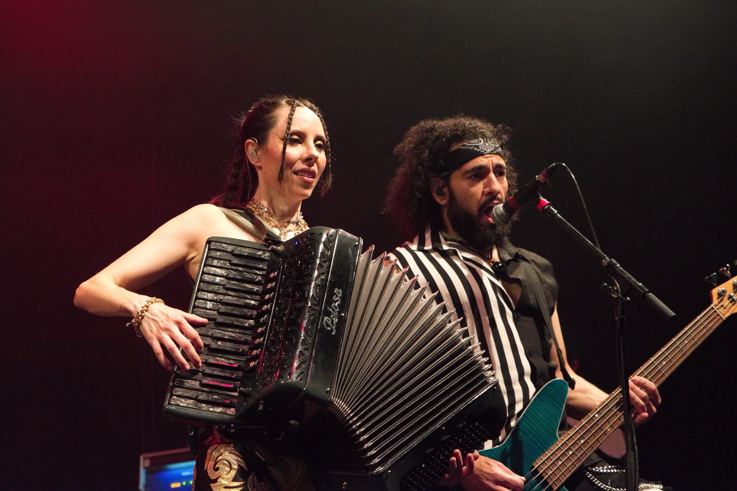 Після перерви настав час хедлайнера. Щойно розпочалося шоу, й не знати було, на кого дивитися в першу чергу – семеро музикантів на сцені створювали унікальне видовище, що зливалося в ідеальну єдність. Юджин Гуц – це особлива постать: його голос упізнаваний одразу, а його енергія неймовірно заразлива. Не можна не згадати й єдину жінку в гурті – Еріку з акордеоном. Вона зачаровувала не лише своєю зовнішністю, але й грою, яка передавала цілу палітру емоцій: від безтурботної радості до легкої запальності, завжди з гумором, без страху бути навіть трохи кумедною. Справжня сценічна постать.